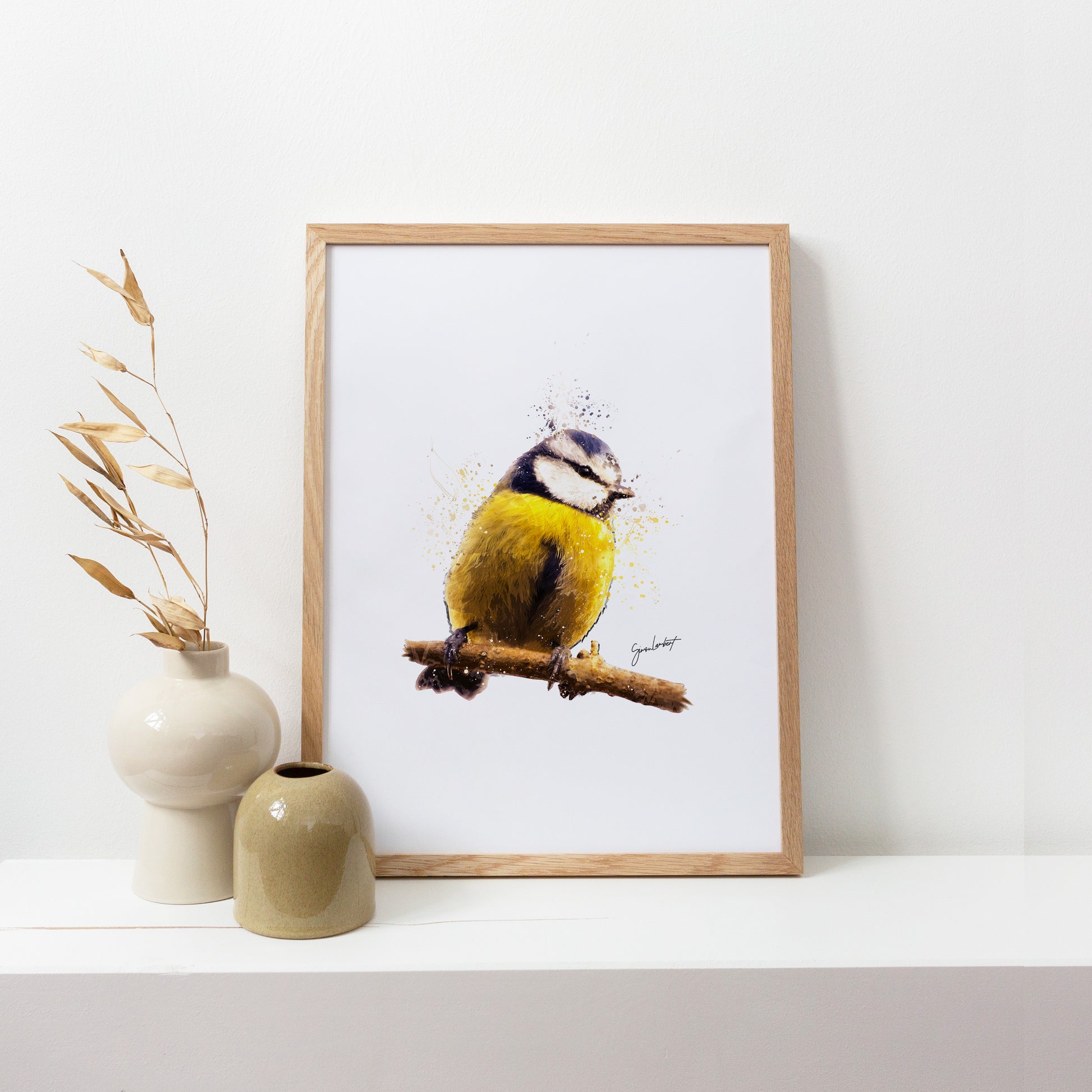Blue Tit Bird Portrait Splatter Style Artwork Fine Art Print (Unframed)