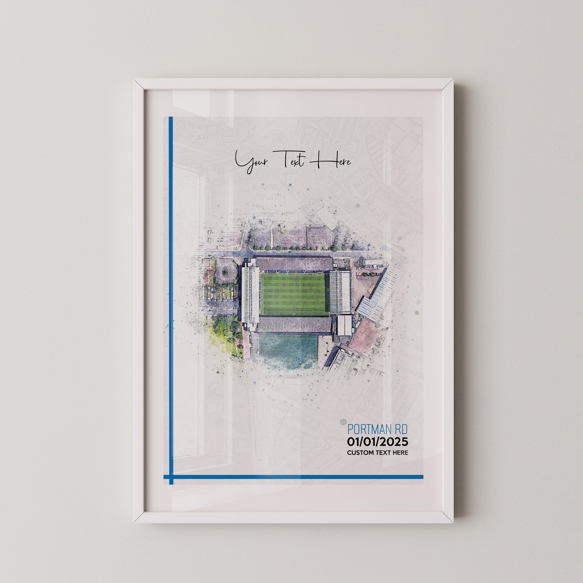 Ipswich, 'Portman Road' Football Stadium Poster Artwork, Personalised Watercolour Art Print, Custom Aerial Layout - Framing options available ANY STADIUM Worldwide.