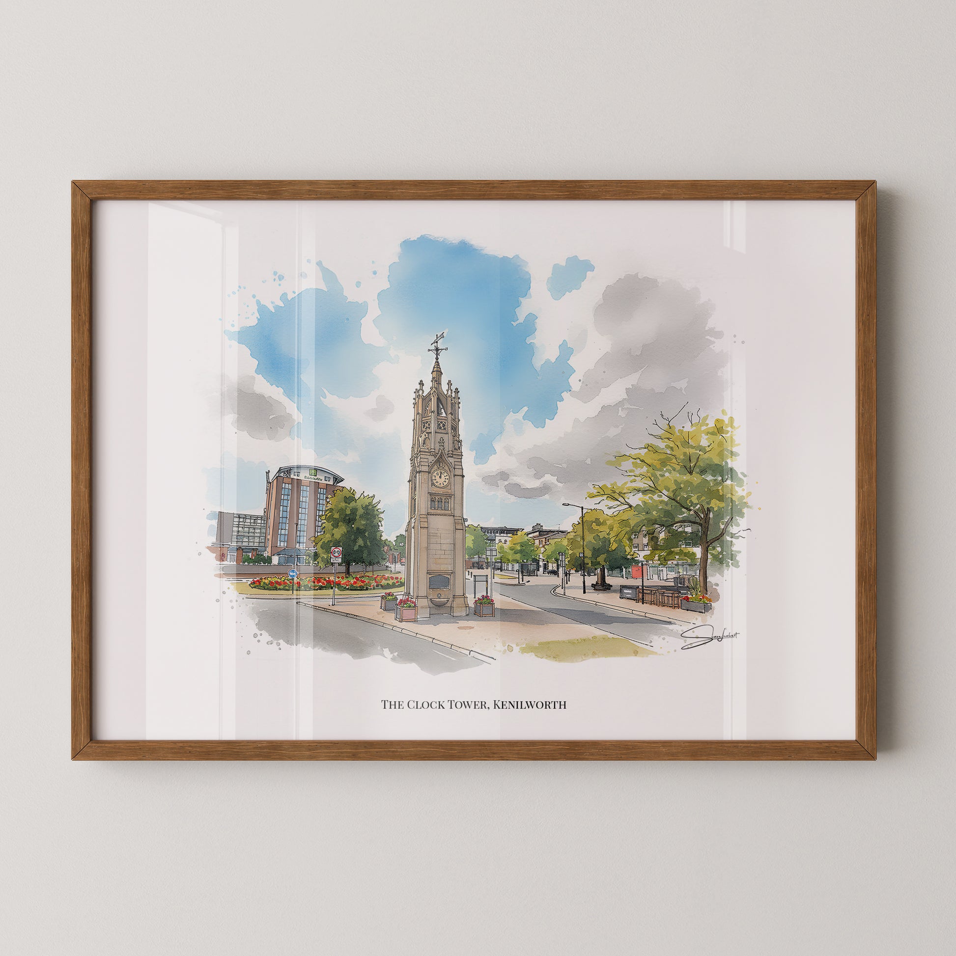 Elevate your home decor with this exquisite Kenilworth Art Print featuring "Kenilworth Clock Tower" an exclusive original watercolour design by local Warwickshire artist Simon Lambert. This stunning piece perfectly captures the historic beauty and serene atmosphere of one of Kenilworth's most beloved green spaces. It is the perfect Warwickshire print for celebrating local pride or giving a truly unique gift.