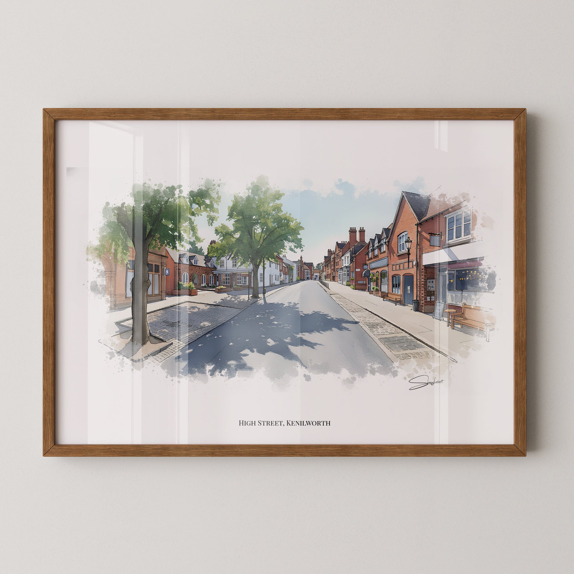 Elevate your home decor with this exquisite Kenilworth Art Print featuring "Kenilworth High Street" an exclusive original watercolour design by local Warwickshire artist Simon Lambert. This stunning piece perfectly captures the historic beauty and serene atmosphere of one of Kenilworth's most beloved green spaces. It is the perfect Warwickshire print for celebrating local pride or giving a truly unique gift.