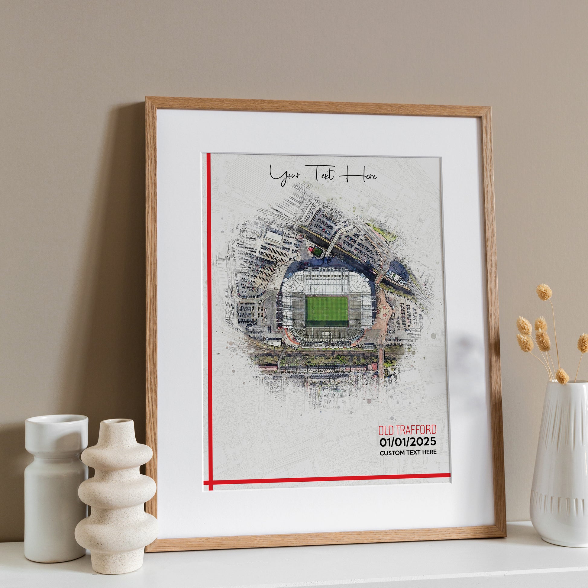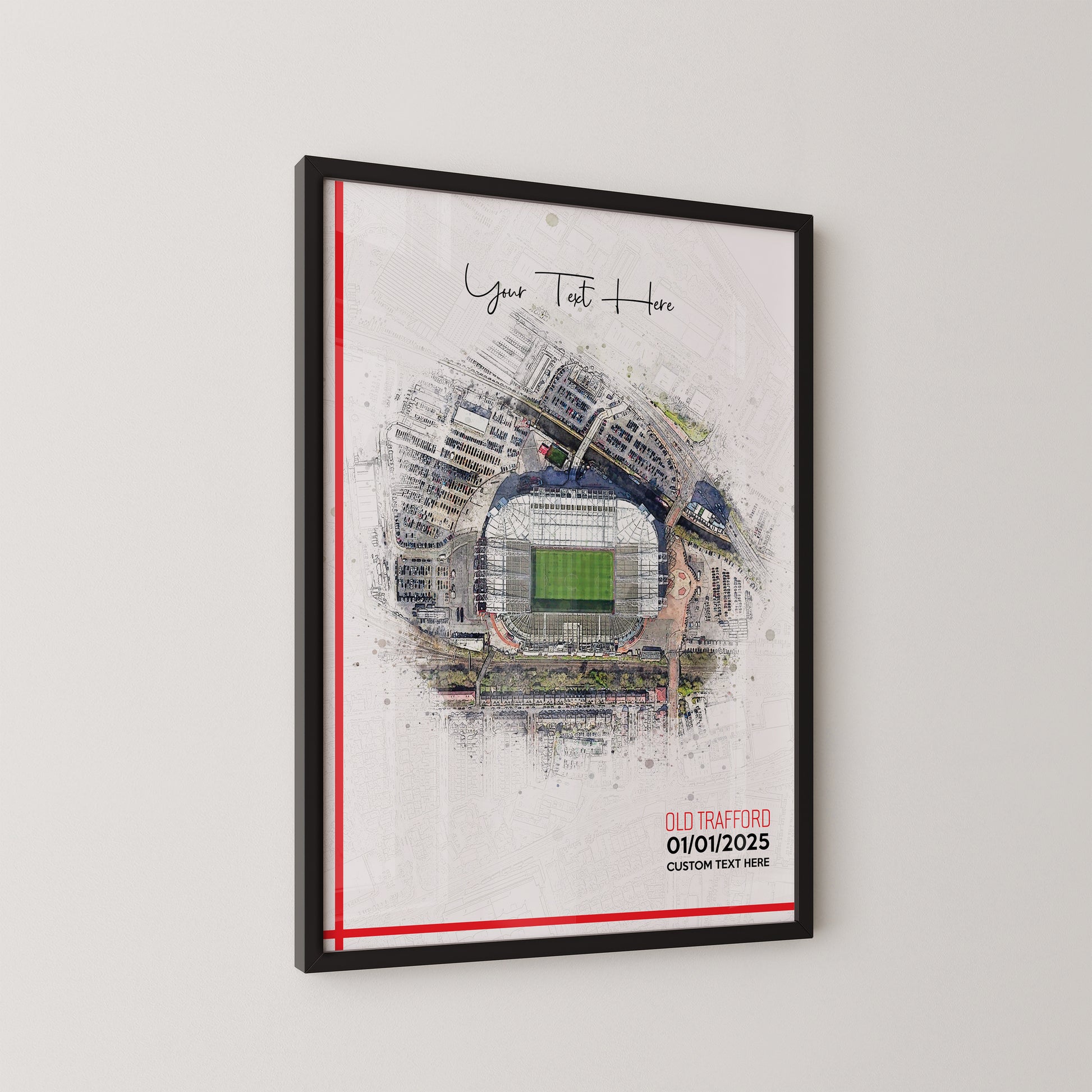 Manchester United, 'Old Trafford' Football Stadium Poster Artwork, Personalised Watercolour Art Print, Custom Aerial Layout - Framing options available ANY STADIUM Worldwide.