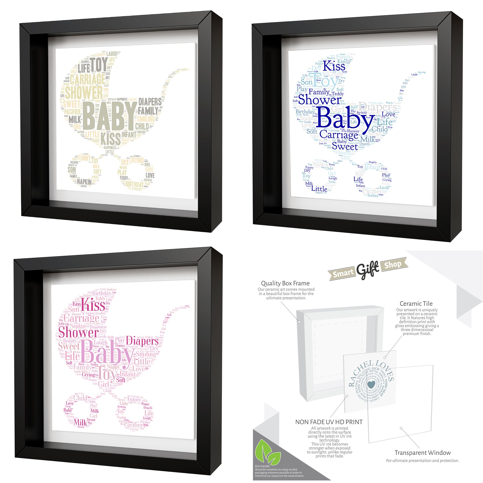 Personalised Baby Celebration Artwork - Framed CERAMIC TILE Print - Baby Pram Design