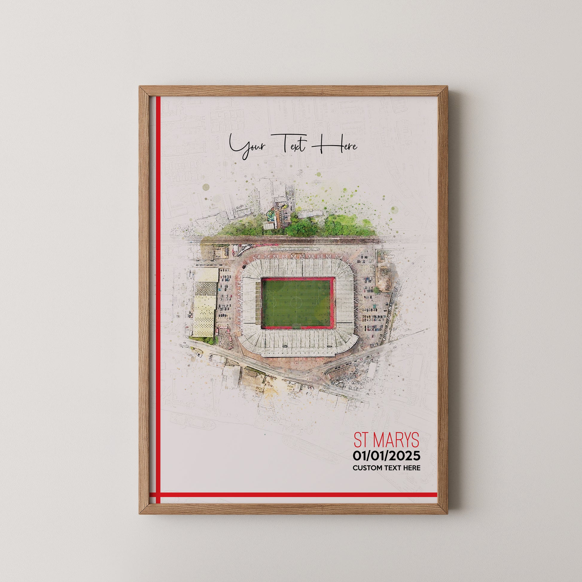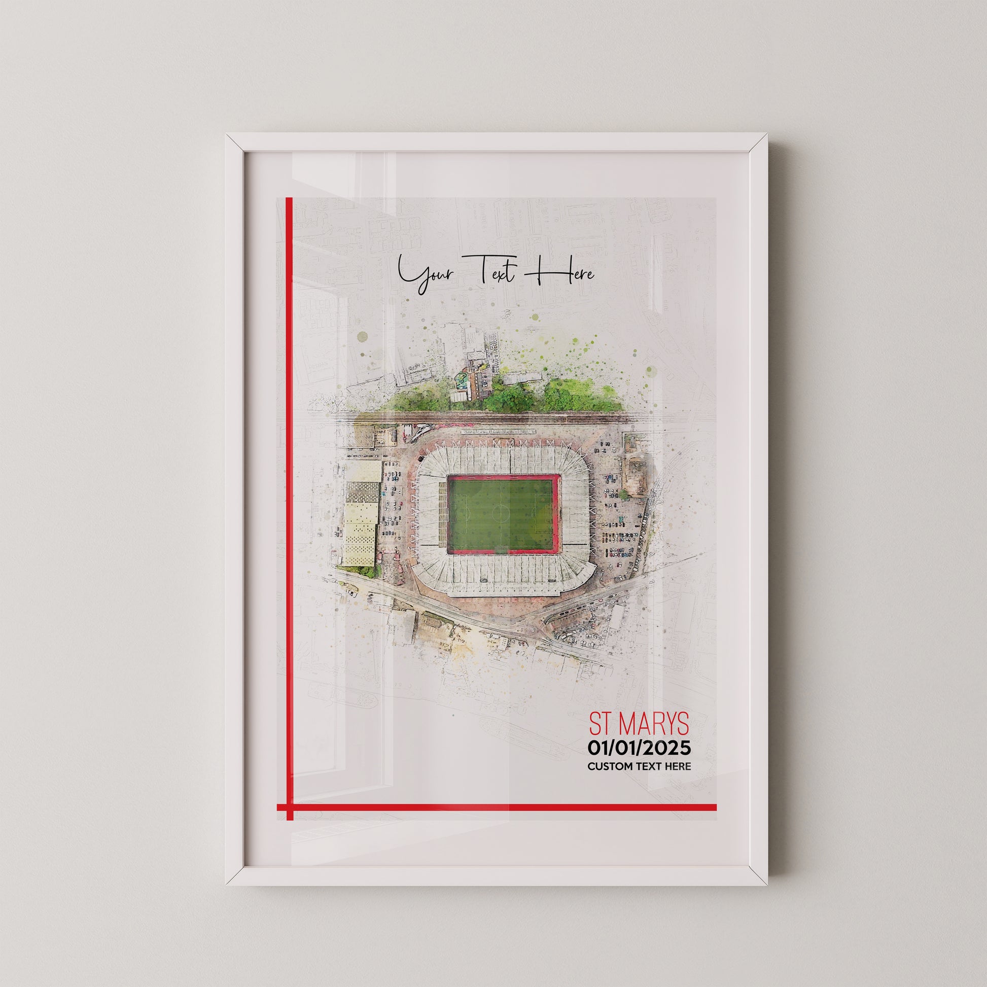 Southampton, 'St Mary's' Football Stadium Poster Artwork, Personalised Watercolour Art Print, Custom Aerial Layout - Framing options available ANY STADIUM Worldwide.