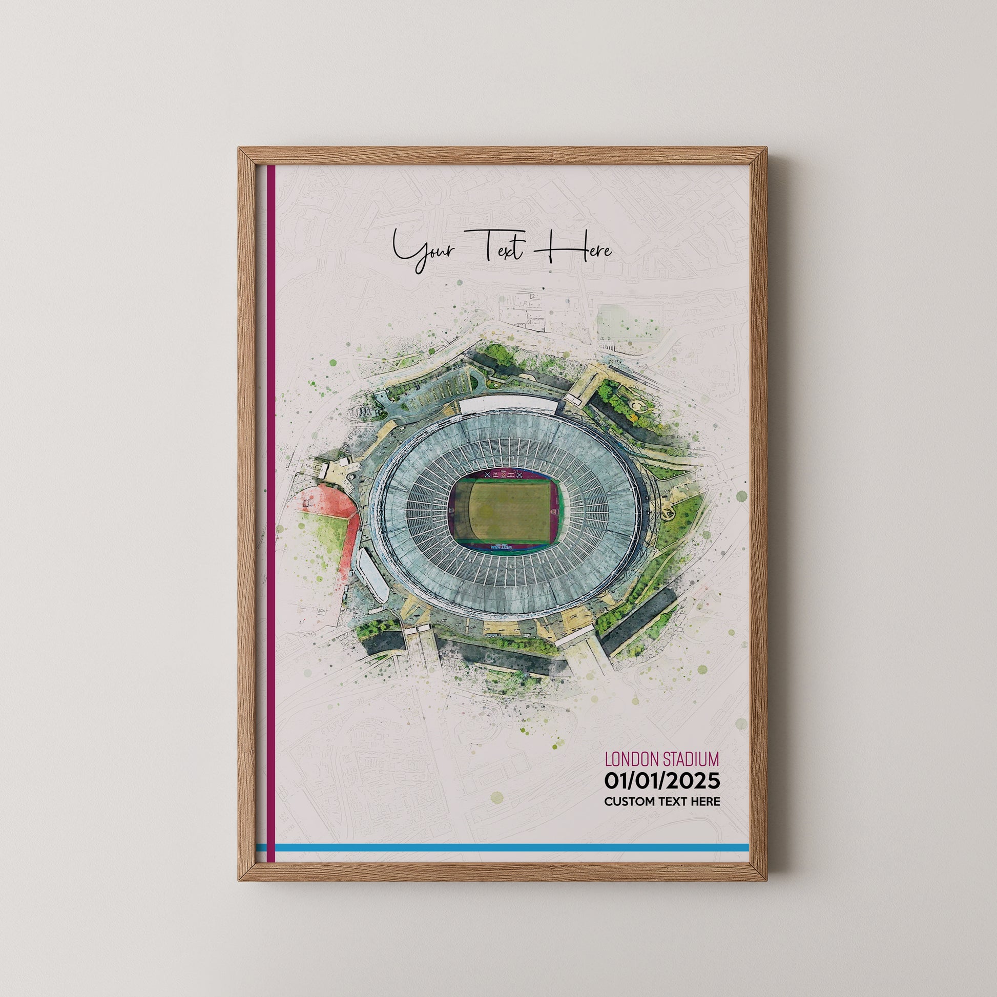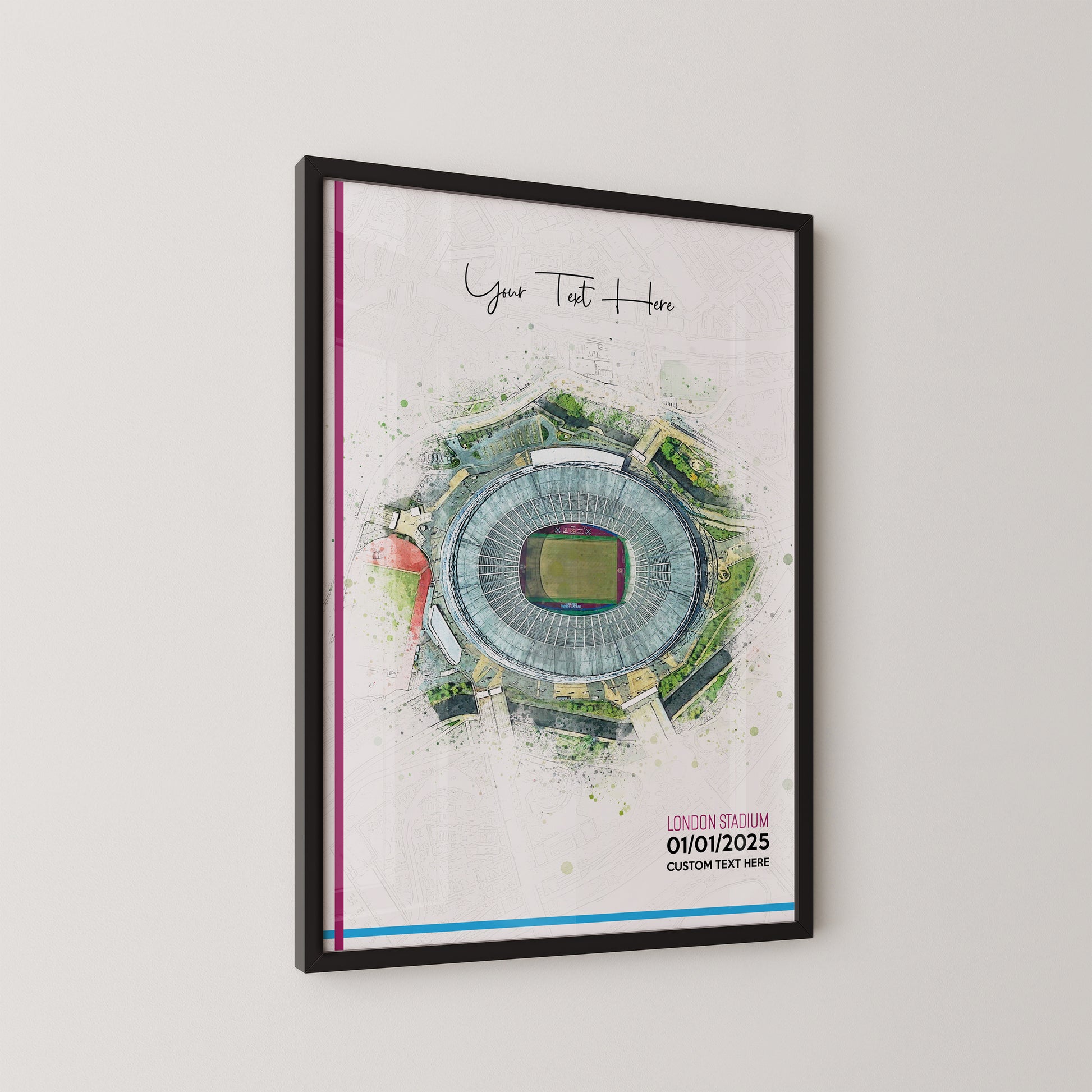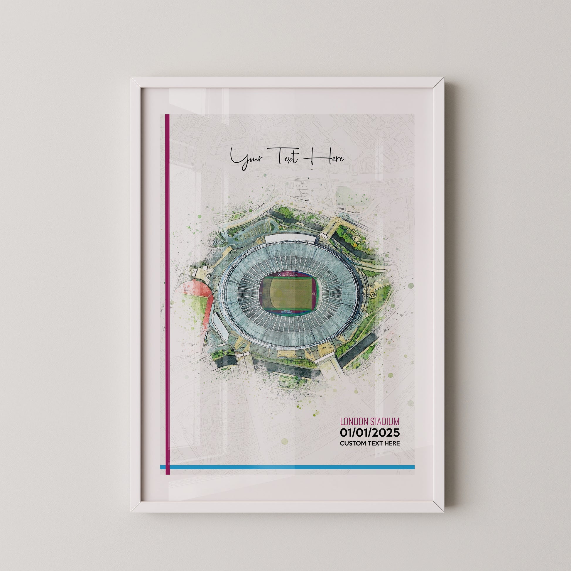 West Ham United, 'London Stadium' Football Stadium Poster Artwork, Personalised Watercolour Art Print, Custom Aerial Layout - Framing options available ANY STADIUM Worldwide.